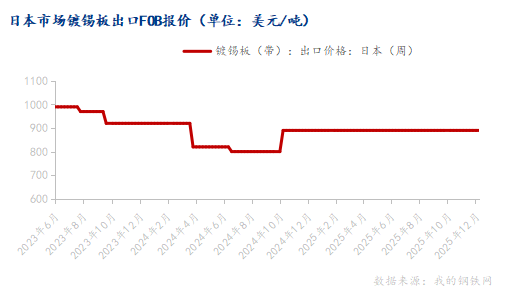 3.4 Japanese tinplate export price focus has shifted upwards. The current export FOB quote is 890 USD/ton, unchanged week-on-week.