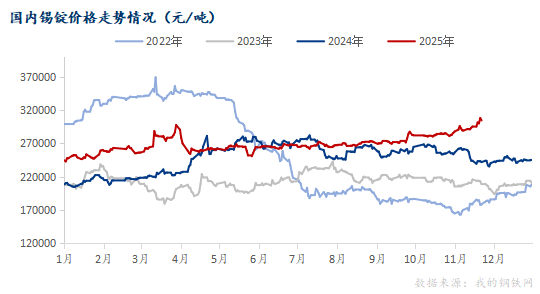 The spot price of tin on the Shanghai market was reported at 300,000 RMB/ton, a month-on-month increase of 15,750 RMB/ton. The average price in November was 290,438 RMB/ton, up 7,761 RMB/ton month-on-month. According to Mysteel calculations, the average tin cost for producing one ton of tinplate (using 0.2mm thickness, double-sided 2.8g coating) is approximately 1,067.75 RMB/ton of steel, with the tin ingot cost increasing by 28.53 RMB/ton month-on-month.