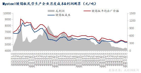 5.4 Tonnage steel gross profit for tinplate producers has gradually narrowed this year, even turning negative for some, with overall profits at low levels. Changes in tinplate production costs and profits are determined by fixed costs in the processing stages and variable prices of raw and auxiliary materials. Processes such as pickling, rolling, tempering, drawing, degreasing, annealing, and electroplating are relatively stable. Cost changes depend more on fluctuations in the prices of raw materials, specifically hot-rolled coil and tin ingots.
