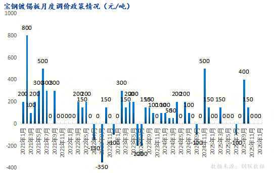 For January 2026, the prices for Baoshan Electrolytic Tinplate (Chromium), Meishan, and Wuhan Iron & Steel Nippon Tinplate products will maintain the base price unchanged from December 2025, with adjustments made to the tin quantity surcharge.
