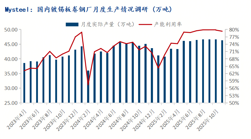 3.1 According to Mysteel’s monitoring of key tinplate producers, the operating rate in November 2025 was 78%, and the capacity utilization rate was 79.29%. Actual tinplate production in November was 463.4 thousand tons, a decrease of 2.7 thousand tons month-on-month. Inventories at the same sample plants were 197.7 thousand tons, a slight increase of 0.02 thousand tons month-on-month. Furthermore, Mysteel’s survey data on key domestic TFS (Tin Free Steel) producers shows TFS production in November totaled 150.5 thousand tons, a marginal increase of 3.2 thousand tons month-on-month.