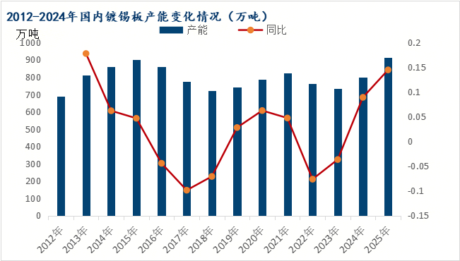 Statistics as of November 2025 show China’s effective tinplate and TFS capacity reached 10.98 million tons, an 11% year-on-year increase. New capacity added this year amounts to 1.35 million tons across 6 production lines, while cumulative capacity elimination in recent years totals 3.12 million tons.