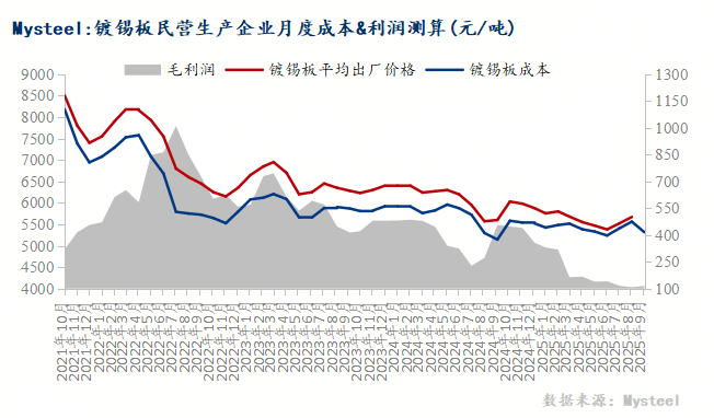 In November 2025, the production cost of tinplate decreased by 4 RMB/ton month-on-month, with a gross profit of 89 RMB/ton, down 26 RMB/ton month-on-month. The overall profitability for integrated enterprises remains relatively good.